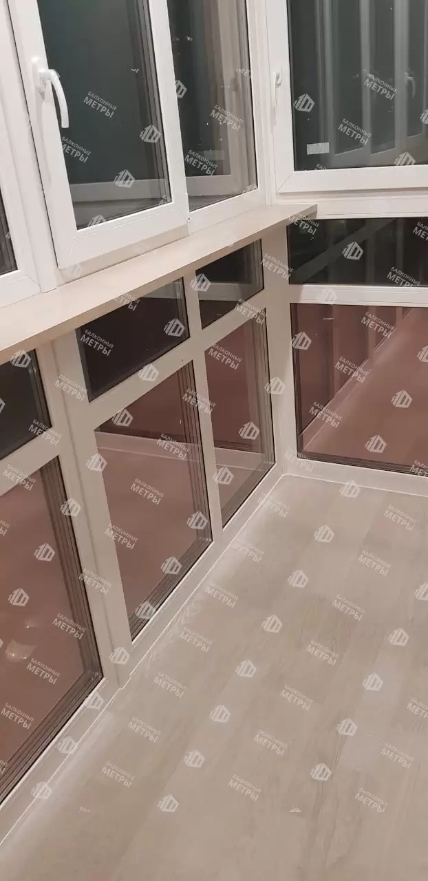 Сделано: панорамное остекление с тонировкой, отделка стен и потолка выполнена ПВХ панелями, пол — ламинат. Выведено и подключено электричество. Материал предоставлялся компанией «Балкония» согласно пожеланиям заказчика.