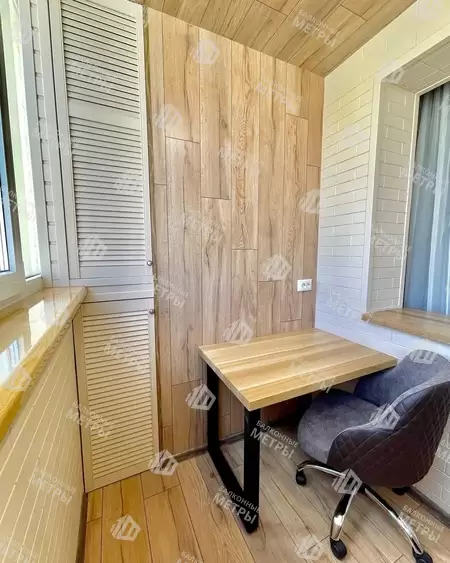 Дизайнерская отделка с утеплением лоджии в доме серии П-111М. Сделано эркерное остекление ПВХ Rehau, обшивка стен ламинатом липа, потолока ламинатом, подключен теплый пол с отделкой ламинат, утепление. Проведено электричество, монтаж светильников. Встроенная, навесная и откидная мебель по индивидуальным размерам. Материал предоставлялся компаний Балкония согласно пожеланиям заказчика.
